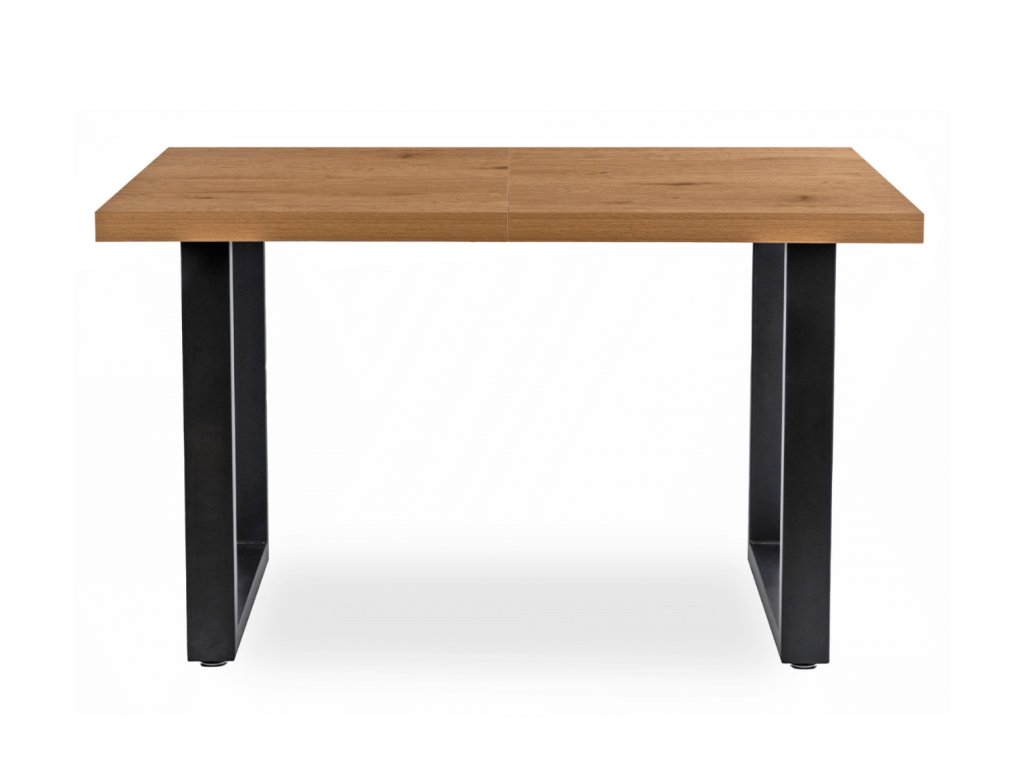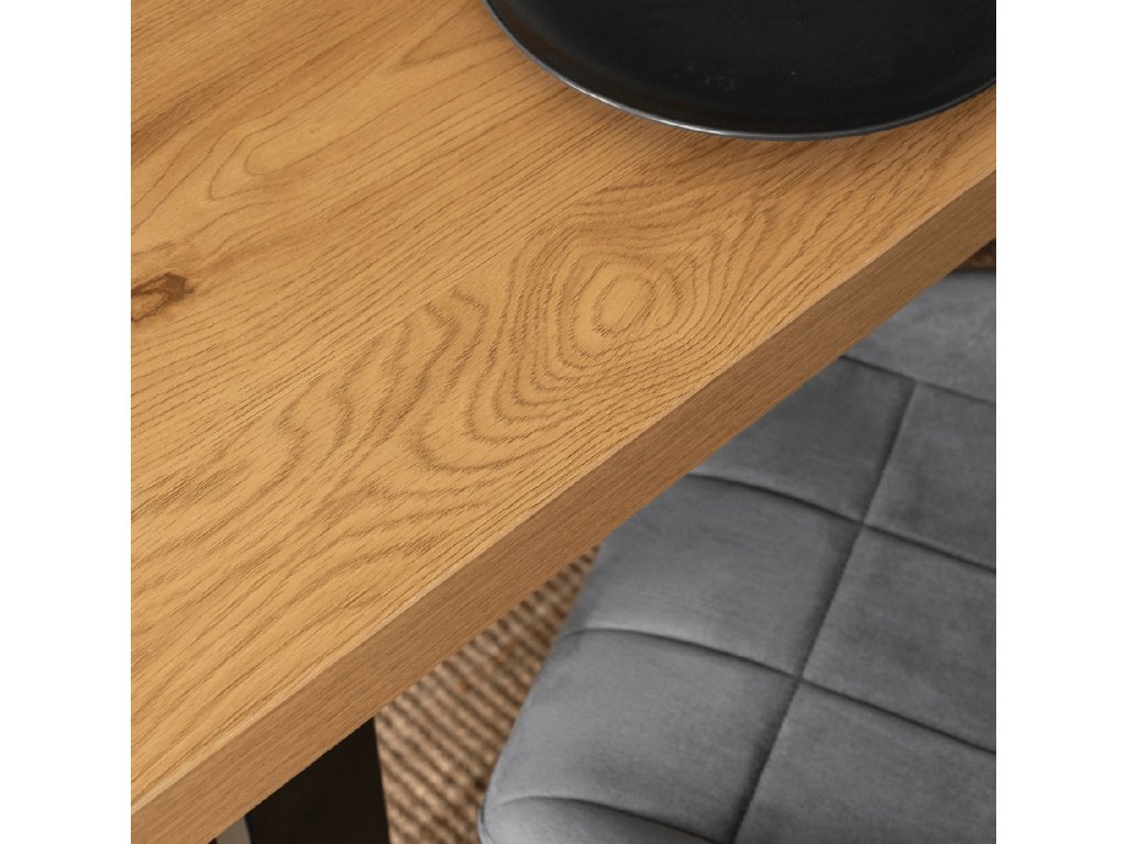 Die Tischplatte ist 5 cm dick und besteht aus laminiertem MDF in der Farbe Goldene Eiche. Sie ist kratz- und stoßfest. Der Tisch verfügt über eine Ausziehfunktion: Einfach den Tisch ausziehen, die zusätzliche Platte einlegen – und schon vergrößert sich der Tisch um 80 cm.