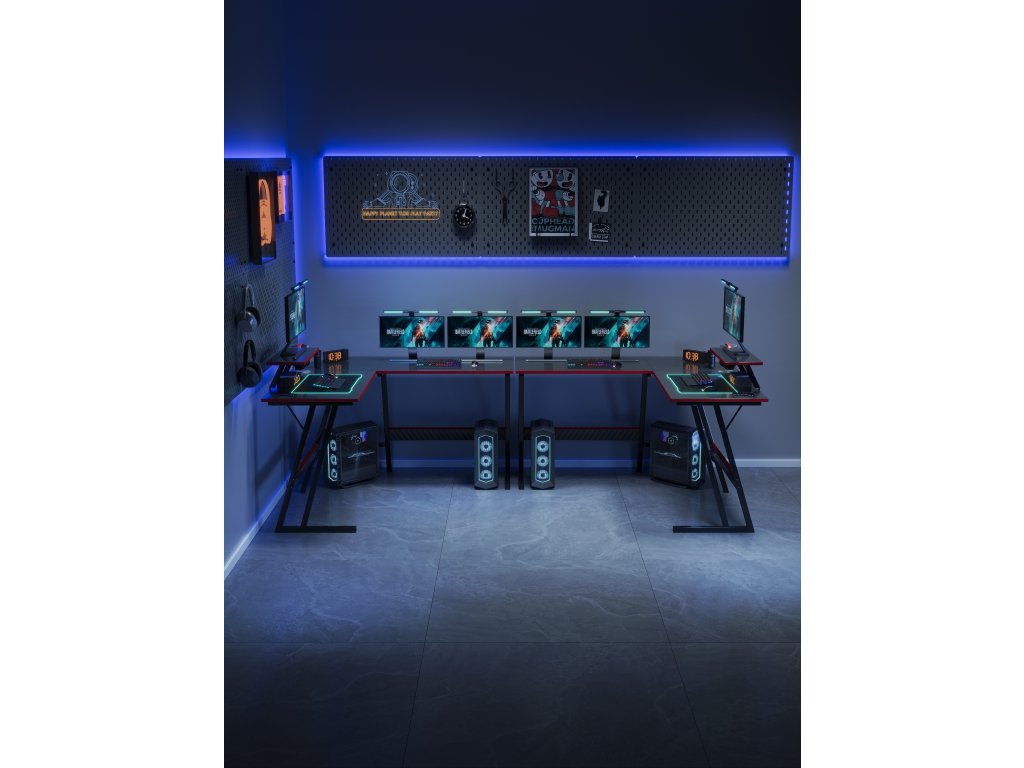 Die Arbeitsfläche von 130 × 130 cm und die Höhe von 74 cm bieten ausreichend Platz für Monitor, Tastatur, Maus und Zubehör. Die durchdachte Form gewährleistet eine ergonomische Sitzhaltung beim Spielen und Lernen. Der Tisch kann durch das Kombinieren von zwei BG02-Modellen erweitert werden, wodurch eine größere Arbeitsstation in L- oder U-Form entsteht.