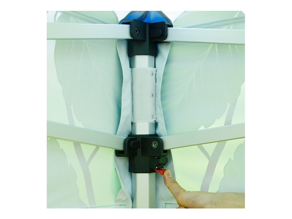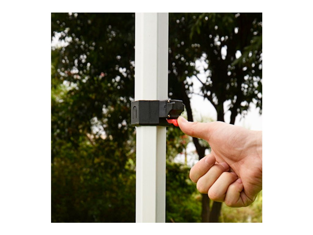 Der Pavillon besteht vollständig aus hochwertigem Aluminiumprofil T6063, das korrosions- und stoßfest ist. Die sechseckigen Beine sorgen für Stabilität auch unter schwierigen Bedingungen. Die Höhe ist in 4 Stufen einstellbar: 190 cm, 200 cm, 210 cm und 220 cm.