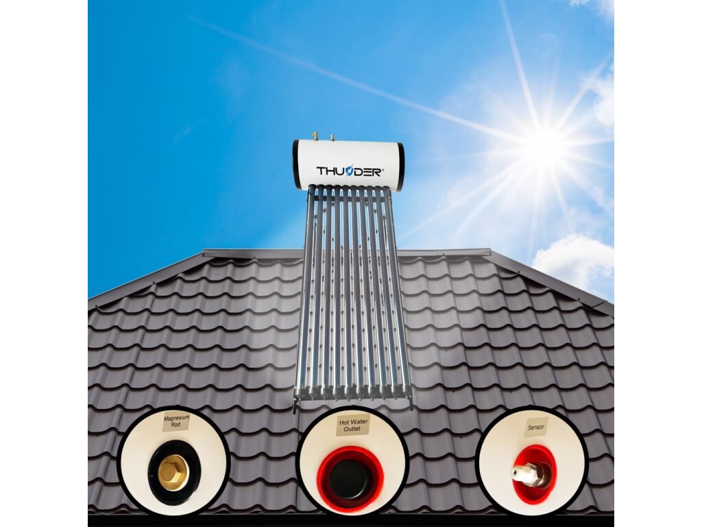 Ein Sonnenkollektor nutzt Sonnenenergie, die erneuerbar ist und die Umwelt nicht verschmutzt. Er dient zur Erwärmung von 100 l, 150 l und 200 l Wasser mit Sonnenenergie auf bis zu 60 °C. Das Wasser im Tank steht unter Druck, sodass Sie es wie einen herkömmlichen Wasserkocher verwenden können. Er hat einen hohen Wirkungsgrad und kann Wasser auch an weniger sonnigen Tagen effizient erwärmen. Ein Vakuumröhre ist für die Erwärmung von maximal 10 l Wasser zuständig.