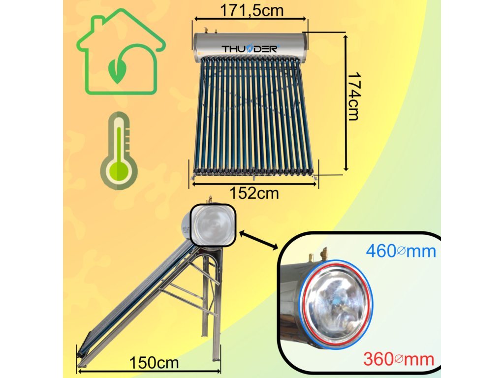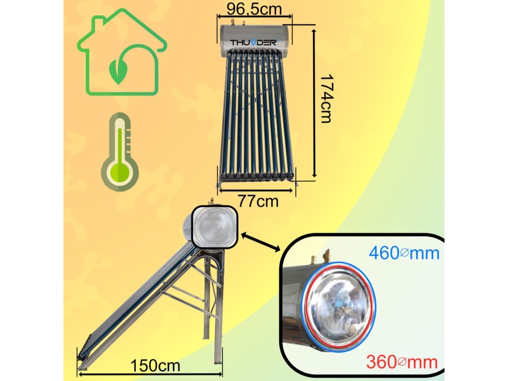 Das Material des Innenbehälters ist Edelstahl und der Werkstoff des Außenbehälters ist verzinkter Stahl, was eine hohe Haltbarkeit und lange Lebensdauer garantiert. Der Kollektor ist einfach zu installieren und erfordert keine Spezialwerkzeuge. Er ist mit einem Sicherheitsventil und einem Thermostat für einen sicheren Betrieb ausgestattet. Die Wärmedämmung des Behälters wird durch 50 mm Polyurethanschaum gewährleistet.