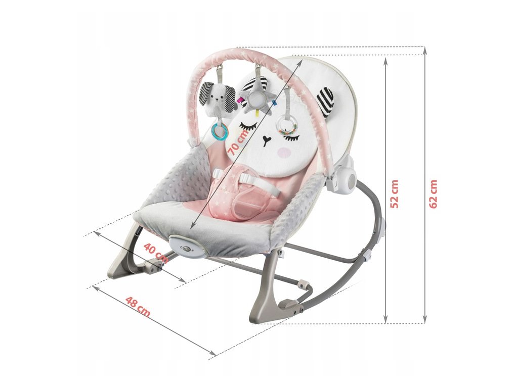 Zeit für Spaß - die Schaukel ist mit einem abnehmbaren Halter mit befestigtem Spielzeug ausgestattet, das seine Sinne entwickelt. Ihr Kind wird Spaß haben, während Sie sich ausruhen können. Diese einzigartigen Spielzeuge regen das Sehvermögen an und entwickeln Tast- und Motorik. Spielzeuge, die mit Klettverschluss an der Halterung befestigt sind, lassen sich leicht entfernen.